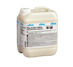 Thermodur-satina Seidenmatte Universal-Dispersion Matte Kunststoffdispersion Hervorragende Filmbildeeigenschaften Besonders strapazierfähig, schmutzabweisend, wischfest und rutschhemmend Sehr gute Wasserbeständigkeit Der matte Film wird auch durch Polieren nicht glänzend Beständig gegen Flächendesinfektionsprodukte Anwendungsbereich Auf wasserbeständigen, beschichtbaren, grundgereinigten Bodenbelägen anwendbar, z. B. PVC, Gummi, Linoleum, saugfähigem Natur- und Kunststein. Bei Belägen mit PU- oder PE-Nutzschicht ist vor der Verarbeitung ein Haftungstest durchzuführen. Anwendung Vor der Erstanwendung ist die Materialverträglichkeit an unauffälliger Stelle zu überprüfen. Produkt vor Gebrauch schütteln! Antrocknung des Produktes im Moppbezug vermeiden. Kanister nach Gebrauch sofort verschließen. Während der Verarbeitung und Abtrocknung Zugluft vermeiden. Beschichten: Je nach Saugfähigkeit der Fläche 2‒3 Aufträge im Abstand von ca. 30 Minuten. Nach erfolgter Grundreinigung und kurzer Trocknungszeit, Produkt unverdünnt z. B. mit einem Flachmopp oder Wischwiesel dünn auftragen. Verbrauch: 25,0 ml/m² pro Auftrag. Zur Unterhaltsreinigung keine Wischpflegeprodukte einsetzen, da durch diese ein Glanzeffekt entstehen kann. Hinweise Für die nicht sachgemäße oder nicht fachgerechte Anwendung und daraus entstehende Schäden kann keine Haftung übernommen werden. Kein Verbraucherprodukt nach 1999/44/EG Art. 1! Vor Frost schützen. Produktzusammensetzung Kunststoffdispersionen, Polyethyle